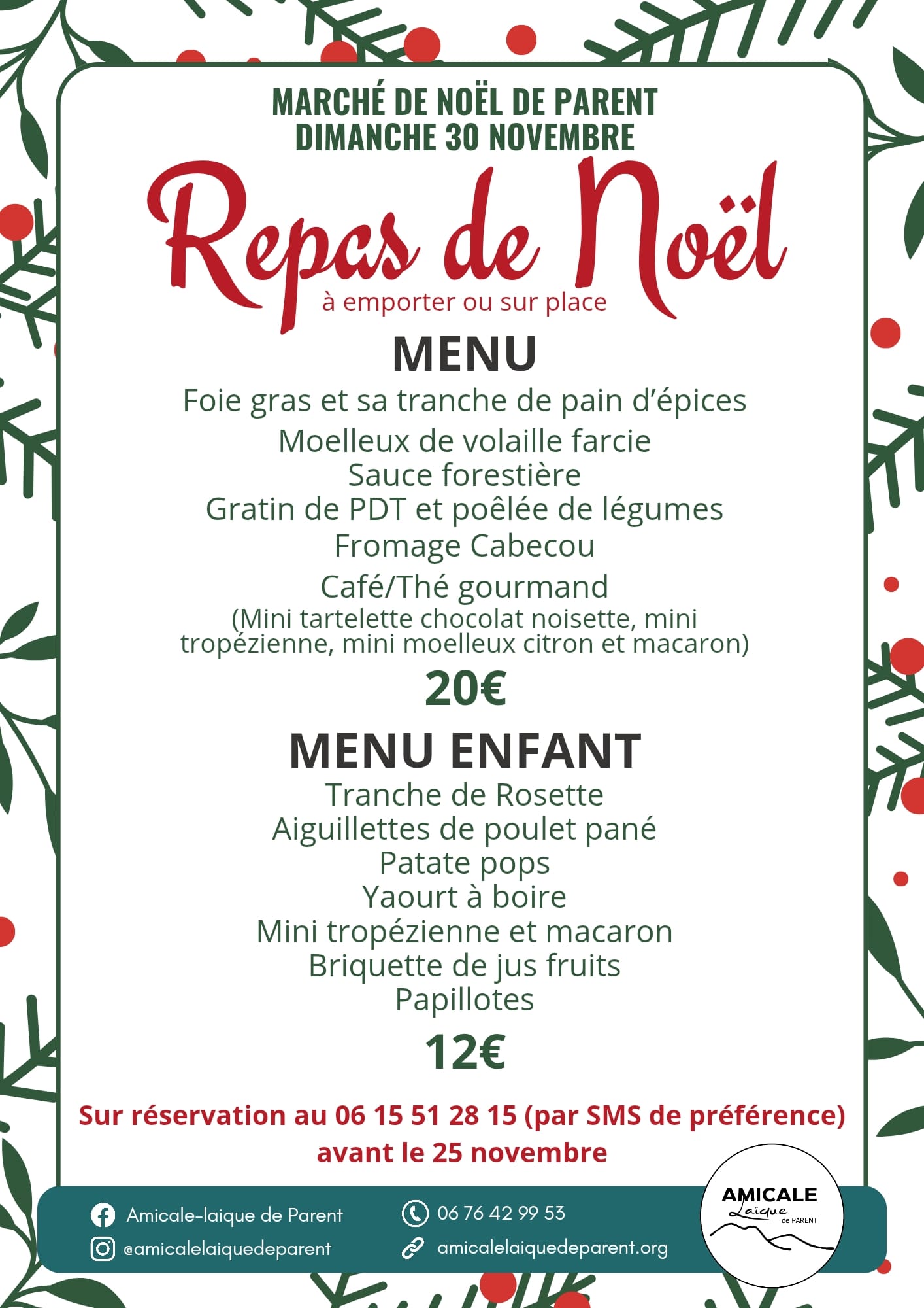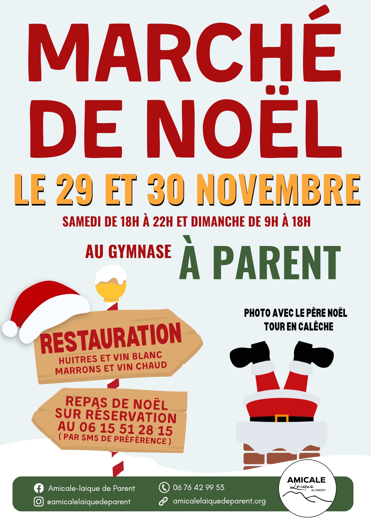 le marché de Noël arrive à grand pas, plein de bons moments à partager: stand de l'école, tour de Parent en calèche, marché en nocturne, huitres et vin blanc, marrons et vin chauds, photo avec le père noël. N'oubliez pas de réserver votre repas (sur place ou à emporter) au 06 76 42 99 53 (nom, prénom et nombre de repas par SMS). Pour les créatifs, il reste encore quelques places d'exposants, contactez Manu CARRASCO au 06 18 20 83 54.