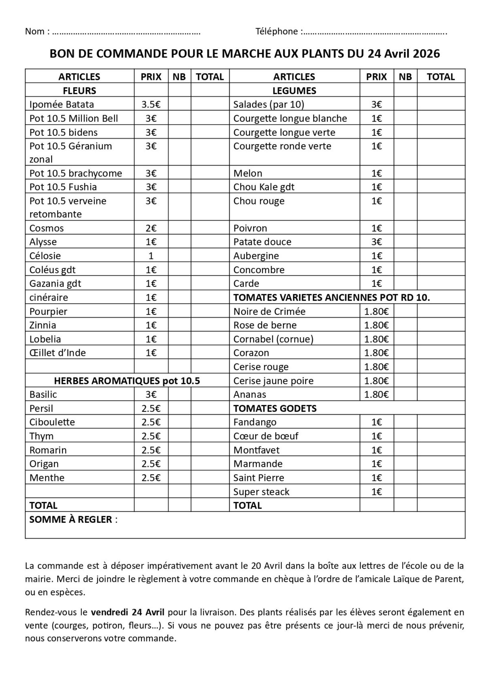 Le marché aux plants est de retour ! Il est temps de passer votre commande pour vos plantations 2026 ! Vous pouvez retrouver en pièce jointe l'affiche mais également le bon de commande à retourner, avec le règlement avant le 20 Avril soit en mairie soit à l'école.