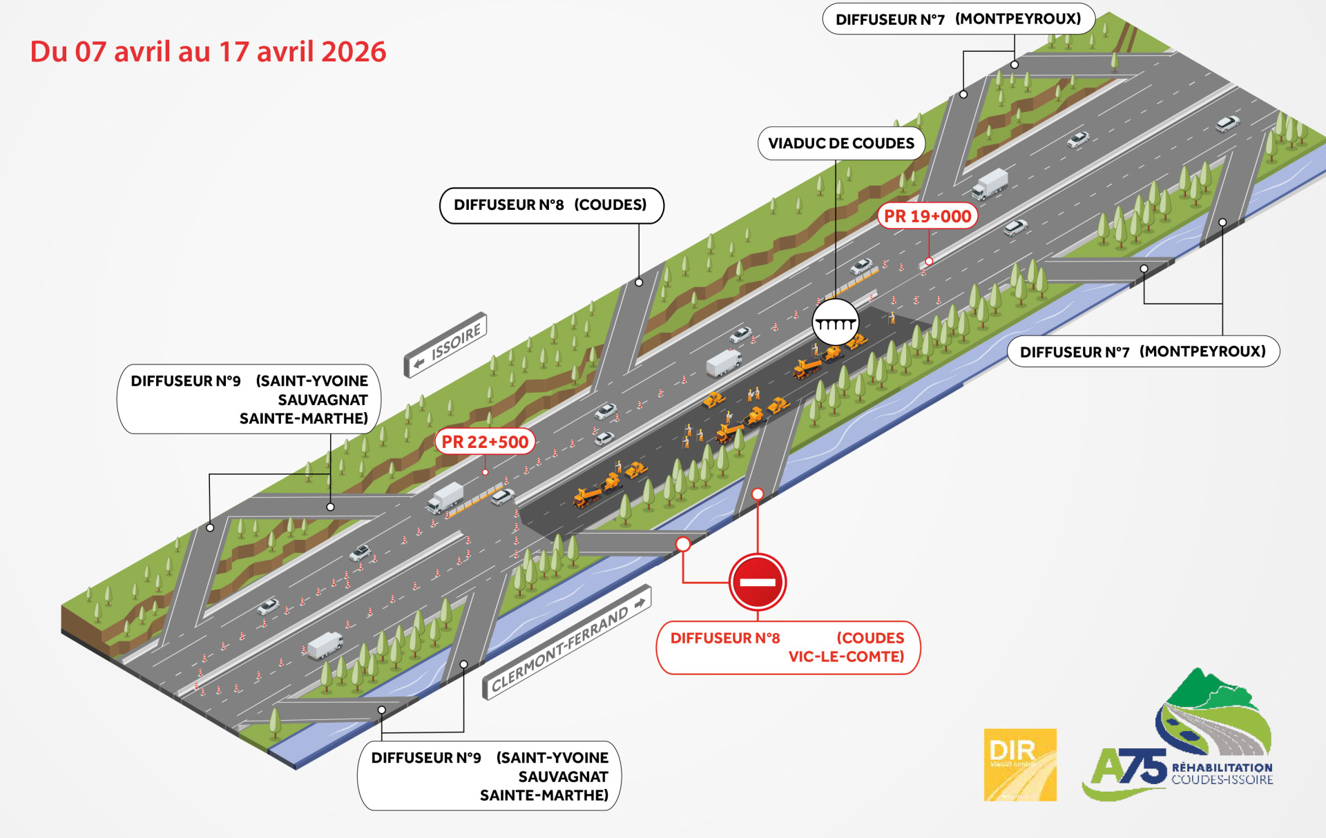 Dans le cadre du chantier Coudes-Issoire sur l'A75, les conditions de circulation vont être modifiées du lundi 7 avril au 17 avril